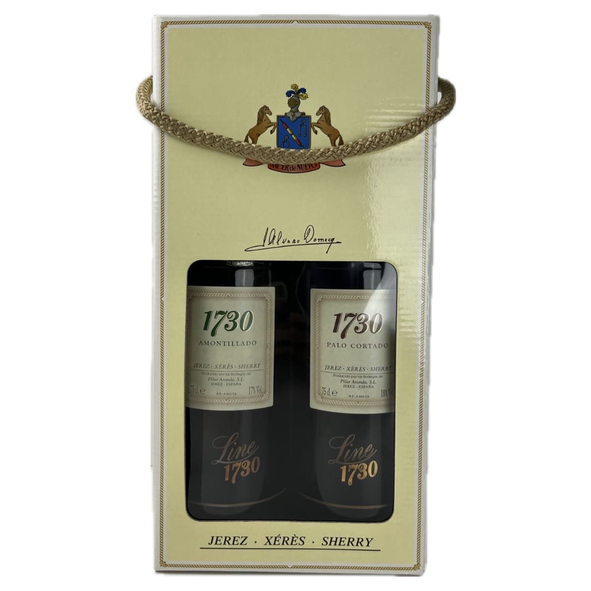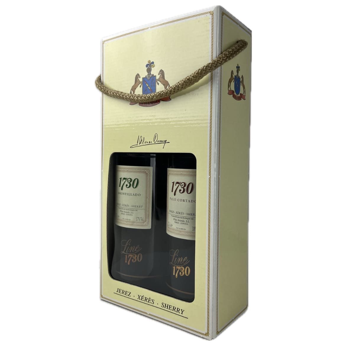 Este estuche Line 1730 Amontillado y Palo Cortado conmemora un hecho histórico: En el año 1730 se produce un hecho que quedó marcado para la historia de nuestra familia. Los Domecq nacen como empresarios bodegueros. Después de dos años, los que han tomado la iniciativa de volver al negocio de vino, queremos hacerle un homenaje a tan señalada fecha, creando una línea de productos de extraordinaria calidad. Nos gustaría unir, a la vejez de estos vinos la overa de nuestro nombre, a través de la crianza de estos vinos de Jerez.