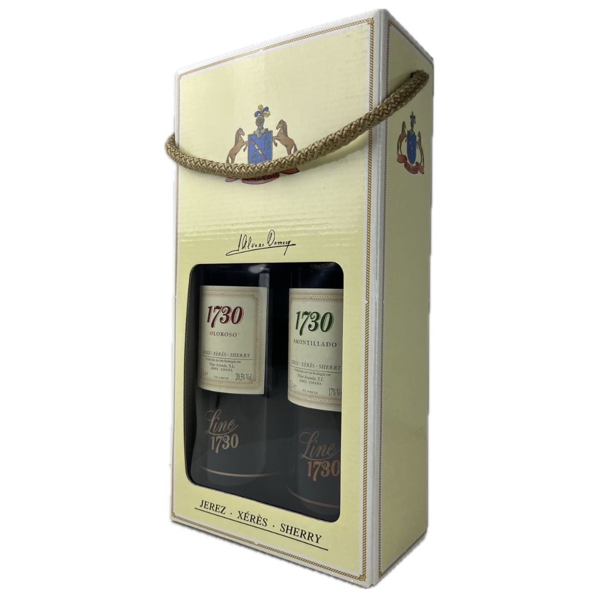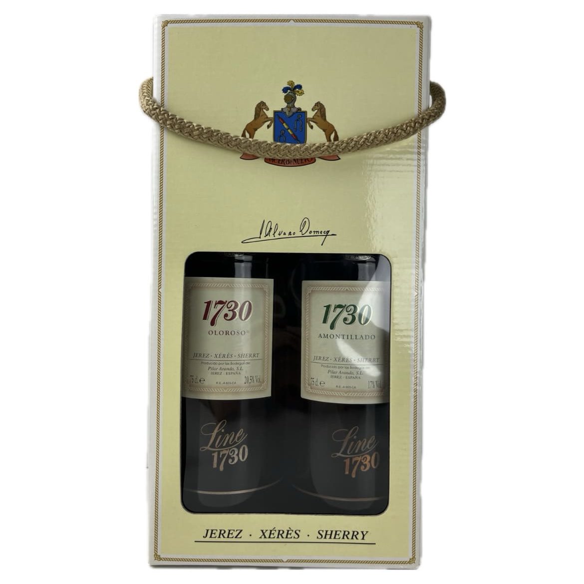 Este estuche Line 1730 Amontillado y Oloroso es un tributo al legado Domecq, del cual Bodegas Pilar Aranda es heredera. El Estuche Álvaro Domecq Line 1730 conmemora una fecha clave: En el año 1730 se produce un hecho que quedó marcado para la historia de nuestra familia. Los Domecq nacen como empresarios bodegueros. Después de dos años, los que han tomado la iniciativa de volver al negocio de vino, queremos hacerle un homenaje a tan señalada fecha, creando una línea de productos de extraordinaria calidad. Nos gustaría unir, a la vejez de estos vinos la overa de nuestro nombre, a través de la crianza de estos vinos de Jerez.